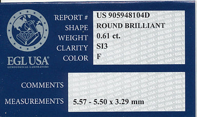 Loose Round 0.61 Carat F Color SI3 Clarity Diamond Natural and Eye Clean with Very Good Cut and EGL USA Certificate
