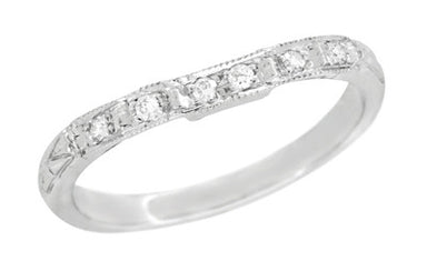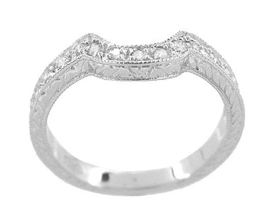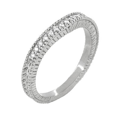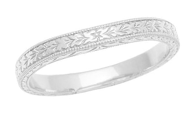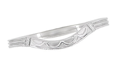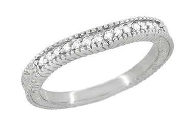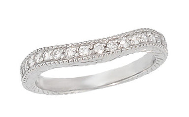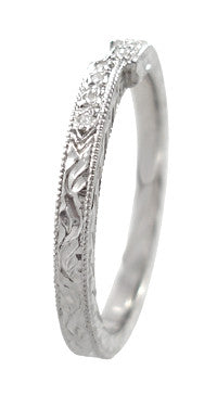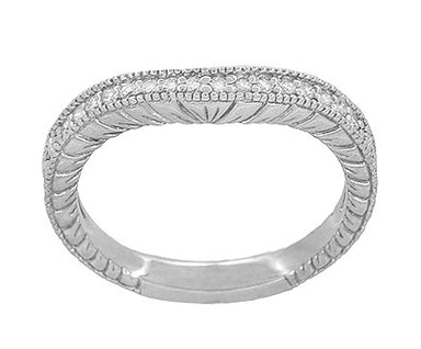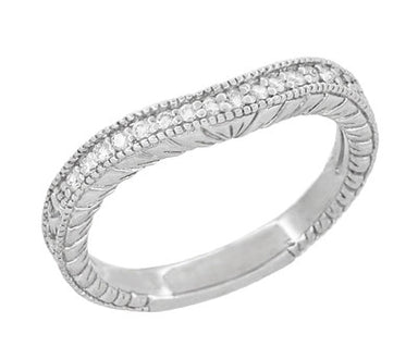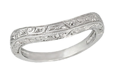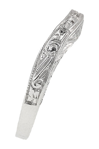 Hand crafted in your choice of 18K or 14K white gold, this curved vintage inspired Art Deco antique style scrolls wedding ring has a detailed engra...