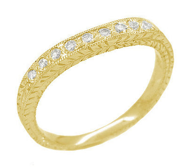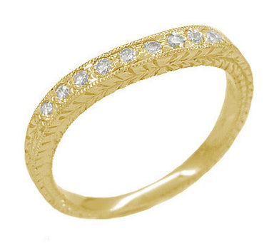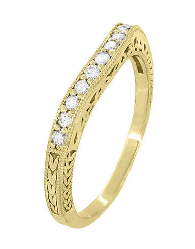 This elegant curved Art Deco yellow gold diamond wedding ring is securely set with 13 shimmering round brilliant cut diamonds of F/G color and VS c...