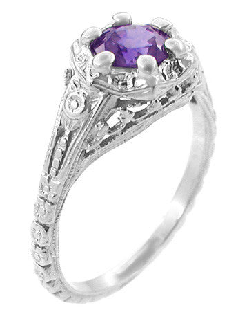This delicate Art Deco filigree amethyst ring in 14K white gold features a vibrant natural purple amethyst ( February Birthstone ) of 0.25 carat, s...
