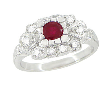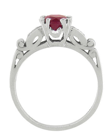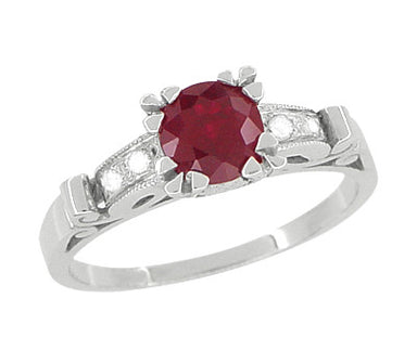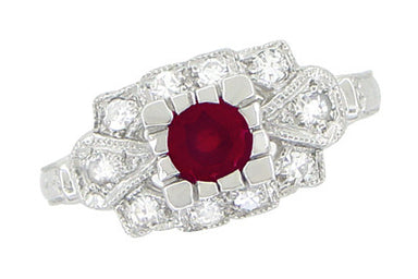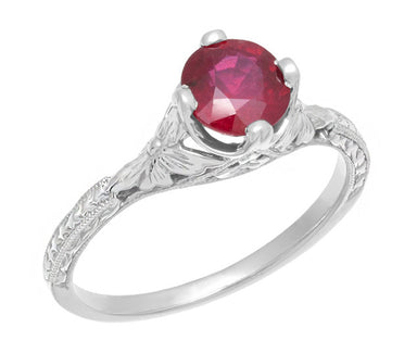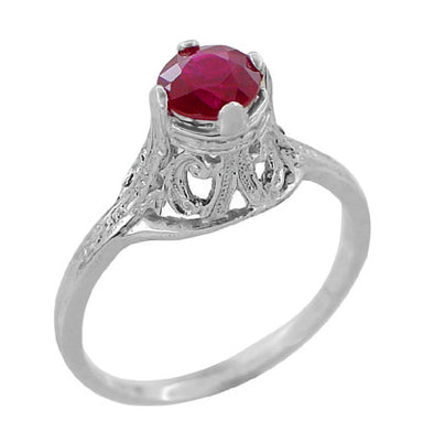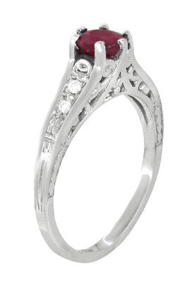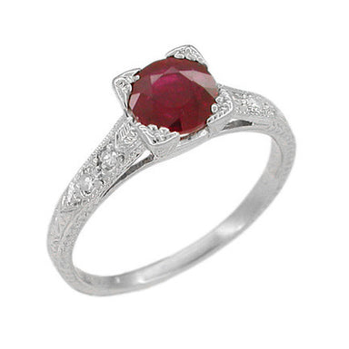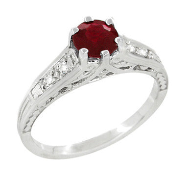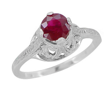 Art Deco Ruby and Diamond Filigree Engraved Engagement Ring in 14 Karat White Gold