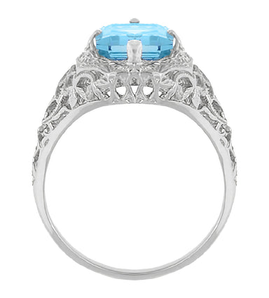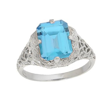 Beautiful to behold, this classic antique reissue Art Deco emerald cut swiss blue topaz ring in 14K white gold features finely detailed pierced fil...