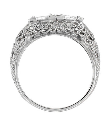 Simply elegant, this Art Deco white topaz promise ring in sterling silver is a visual delight! Dainty filigree openwork and floral engraving grace ...