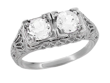 This elegant vintage Art Deco two stone white topaz ring design is crafted in sterling silver with detailed filigree openwork on all 4 sides. An or...
