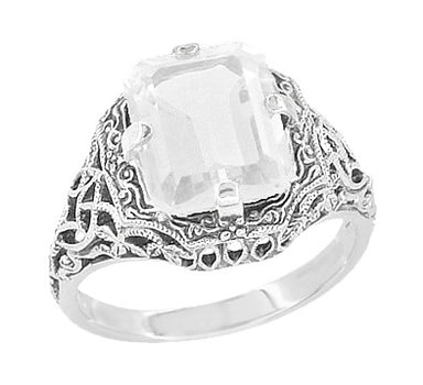 This stunning white topaz Art Deco filigree ring in sterling silver features a gorgeous emerald cut white topaz of 3.75 carats in a secure four pro...