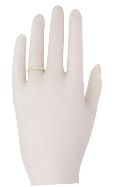 Art Deco wedding bands in classic 1920's and 1930's wedding ring styles are perfect to express your love for a lifetime. Our selection of antique Art Deco wedding bands for women and men features highly detailed hand engraved Art Deco wedding rings in platinum with elegant carved geometric patterns, gemstones and diamonds, as well as timeless artisan made reproduction vintage Art Deco wedding bands in white gold, yellow gold and rose gold. Although most heirloom Art Deco style wedding rings here are one-of-a-kind, some Art Deco wedding band designs in our collection are antique replica Art Deco wedding rings which can be custom made to order in your size in platinum or gold. To create your own bespoke Art Deco wedding band, please contact us.
