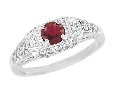 Art Deco Ruby and Diamond Filigree Engraved Engagement Ring in 14 Karat White Gold