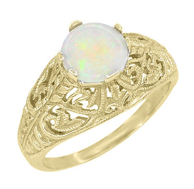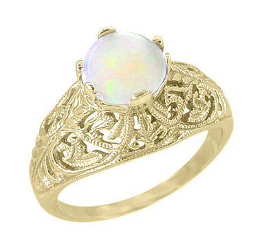 This elegant 14K yellow gold Edwardian filigree opal ring features a securely 6 prong set cabochon natural fiery white opal ( October Birthstone ) ...