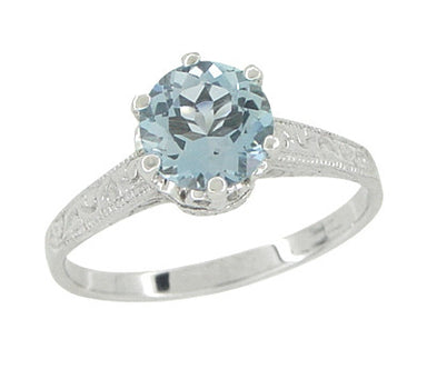 A royal crown ring fit for a princess, this platinum Art Deco aquamarine crown solitaire engagement ring features a stunning round brilliant cut na...
