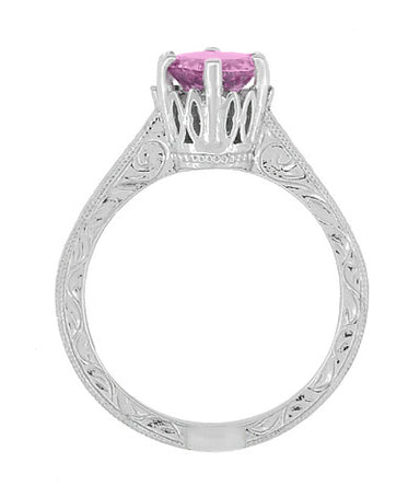 The perfect pairing of lavish platinum and the playful romance of briliant pink sapphire, this simply elegant Art Deco antique style solitaire pink...