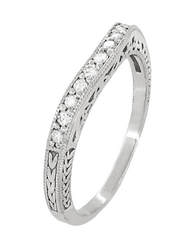 Hand crafted in platinum, this Art Deco curved wedding ring features an intricate filigree design on the sides of the ring and a vintage engraved w...