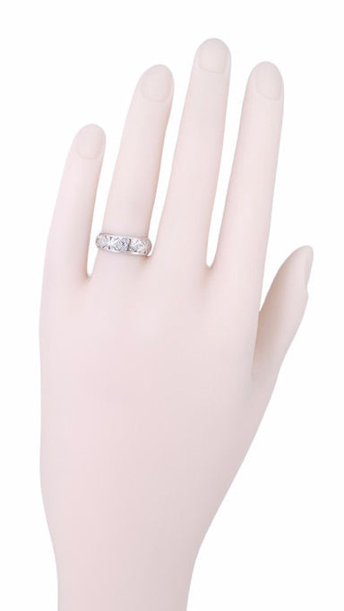 This elegant 1920's reissue Art Deco vintage diamond wedding ring design in white gold features a romantic hand carved scroll design decorating the...