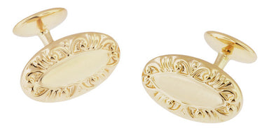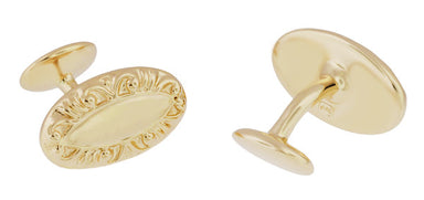 These oval Victorian yellow gold vermeil cufflinks in solid sterling silver with a yellow gold finish feature a traditional vintage scrolls and fle...