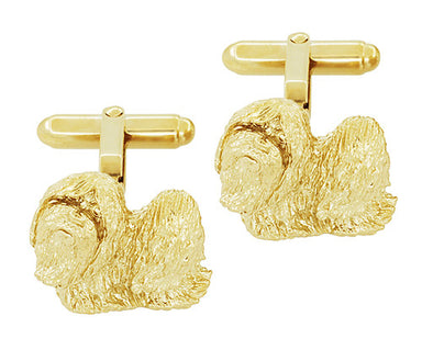 These heavy sterling silver shih-tzu cuff links measure 3/4 inch long by 5/8 inch high, with a bright high polish anti-tarnish 18K yellow gold fini...