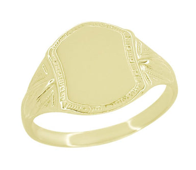 This classic low profile yellow gold Victorian small signet ring for a woman or a man has a center high polish shield shape of 8mm x 9.5mm (5/16 in...