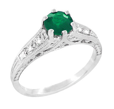 This wonderful platinum vintage inspired Art Deco filigree emerald engagement ring features a beautiful natural deep green emerald ( May Birthstone...