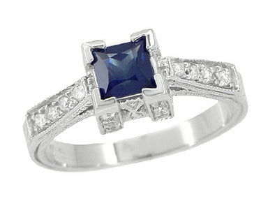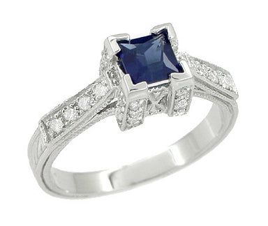 This distinctive Art Deco filigree antique inspired square blue sapphire engagement ring is artisan crafted in platinum, and set with a gorgeous sq...