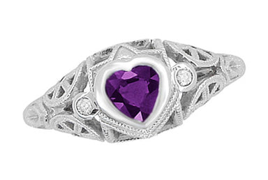 Low Profile Art Deco Heart Shaped Amethyst and Diamond Filigree Engagement Ring in 14 Karat White Gold
