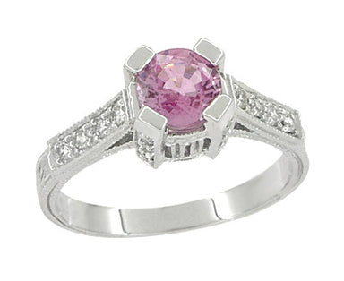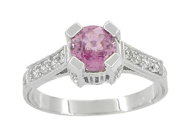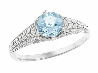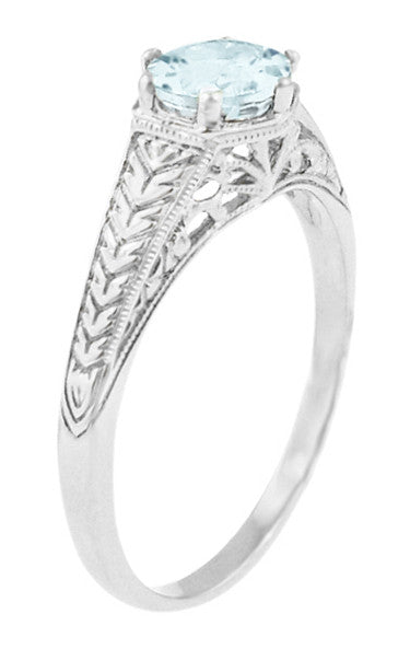 R356P75AThis Art Deco filigree aquamarine engagement ring in platinum features a securely 4 prong set shimmering round brilliant cut natural aquamarine ( M...