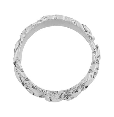 This unique 14K white gold Retro wedding ring features a lovely engraved roses and leaves design all the way around the band in an unbroken pattern...