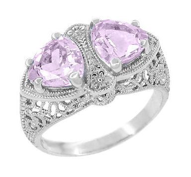 This exquisite filigree morganite two stone ring in 14K white gold is set with 2 beautiful shimmering trillion shaped natural peach-pink color morg...