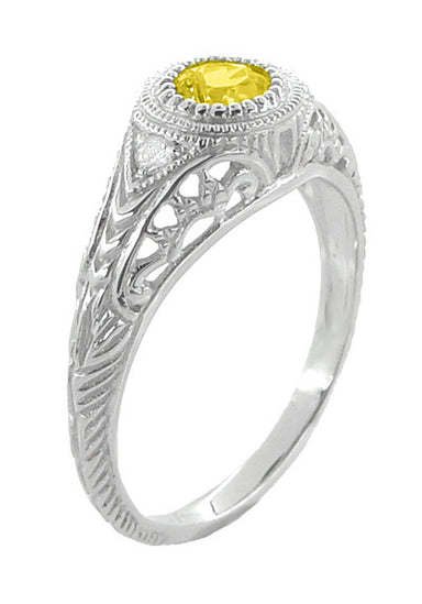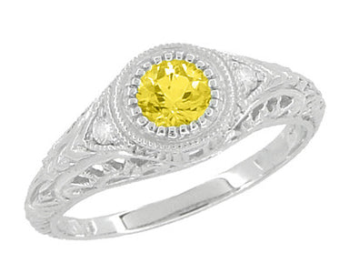 Art Deco Engraved Platinum Yellow Sapphire and Diamond Filigree Engagement Ring