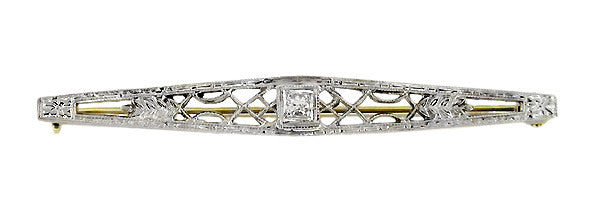 Art Deco Filigree Diamond Set Bar Brooch in 10 Karat White and Yellow Gold