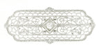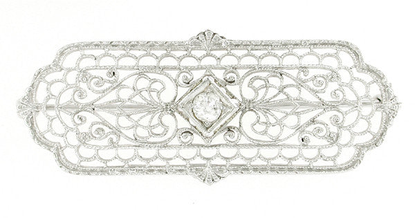 Circa 1915, this lavish vintage Edwardian filigree broach is finely crafted in lustrous 10K white gold. The shape of a rounded rectangle with bombe ends graced with an engraved scalloped pattern frames two elaborate filigree hearts which meet in the center of the design, surrounded by delicate scrollwork. The elegant filigree provides a lyrical backdrop for an old mine cut diamond ( April Birthstone ) of 0.10 carat, securely 4 prong set in a square frame with millgrain edging. This wonderful estate brooch measures 1 3/4 inches wide by 11/16 inch high and has a lever safety catch for security. A stunning piece from another time in wonderful original condition, the serene radiance of this timeless classic brooch is sure to make you feel special.