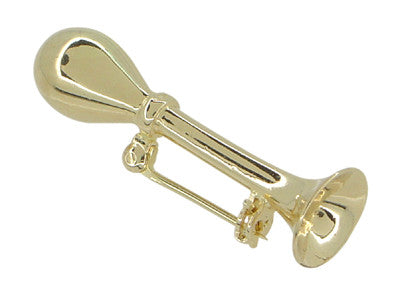 Expertly crafted in solid 14K yellow gold, this rare antique car horn jewelry design features a beautifully detailed three dimensional horn with a secure hinged pin and safety catch.