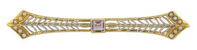 Vintage Edwardian Filigree Seed Pearl and Amethyst Bar Brooch in 14 Karat Yellow and White Gold