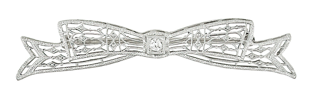 Antique 1920's Art Deco Old European Cut Diamond Engraved Filigree Bow Brooch in 14 Karat White Gold