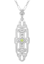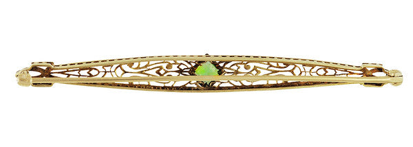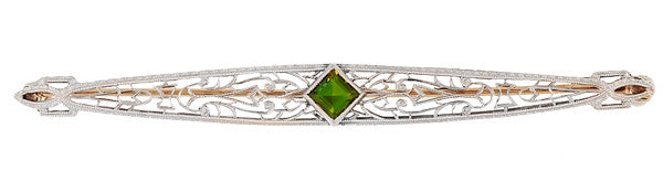 Art Deco Filigree Peridot Bar Brooch in 14 Karat White and Yellow Gold