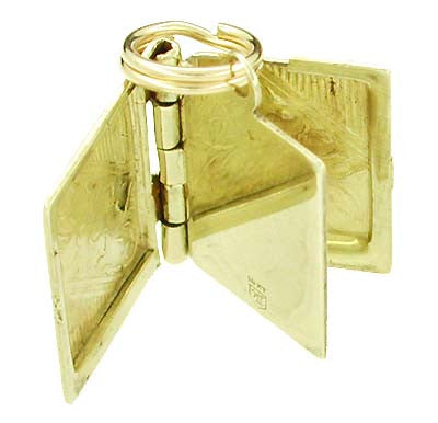 Celebrate your love of the written word with this delightful moveable estate book charm, circa 1950's. The two hinged 10K yellow gold covers of the book actually open to reveal an inner page that could be engraved with a special sentimental message. The back and front covers of the vintage pendant are engraved with lines and the lyrical and romantic curves of a flower and leaves. This lovely charm measures 11/16 inch high and 7/16 inch wide and features a large 14K yellow gold split ring bail that makes this charm perfect to wear on a favorite neckchain or easily and securely attaches this charm to a charm bracelet.