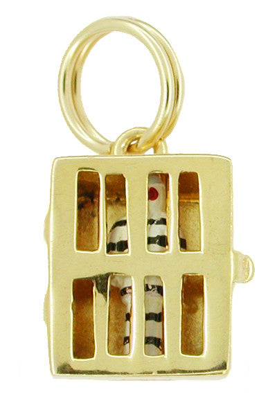 Celebrate new beginnings with this whimsical and uncommon vintage jail cell charm, circa 1950's. The moveable hinged jail cell door of this estate pendant swings open to reveal a newly released prisoner, clad in black and white enamel stripes. Sure to "capture" a second glance, this unique 14K yellow gold charm measures approximately 1/2 inch high by 3/8 inch wide and features a 14K yellow gold split ring bail that makes this charm perfect to wear on a favorite neckchain or easily and securely attaches this charm to a charm bracelet.