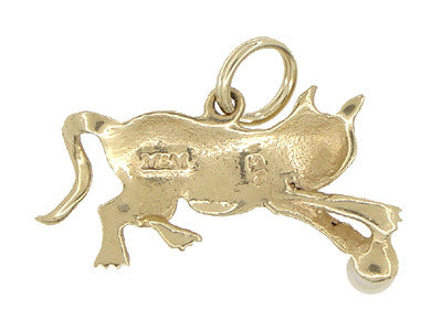 Perfect for a cat lover, this cute charm in 14K gold is meticulously detailed and features a playful kitty toying with a genuine cultured pearl "ball". Circa 1960's, this unique vintage charm measures 1/2 inch high by 1 inch wide and features a 14K yellow gold split ring bail that makes this charm perfect to wear on a favorite neckchain or easily and securely attaches this charm to a charm bracelet.