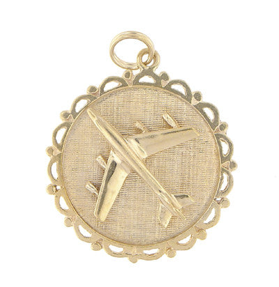 Celebrate the adventure of the skies with this delightful 747 jet airplane pendant! This beautiful three dimensional solid 14K yellow gold air plane charm features a high polish flat surface on the back, perfect for engraving. Perfect for anyone who loves the freedom of air travel or for your favorite pilot, this substantial vintage plane medallion charm measures 1 1/4 inch in diameter and features a 14K yellow gold split ring bail for wear on your necklace.