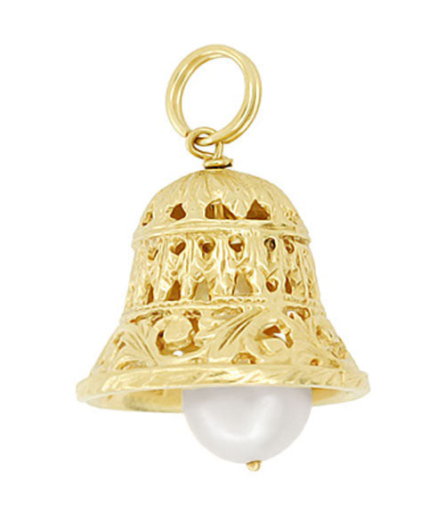 Movable Filigree Bell Charm with Pearl in 14 Karat Gold