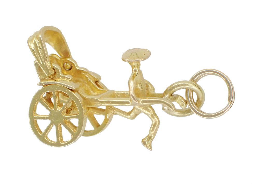 Celebrate a recent trip to Asia or your love of transportation with this movable vintage rickshaw charm in 14K yellow gold, featuring wheels that actually spin, and a collapsible movable passenger shade!
