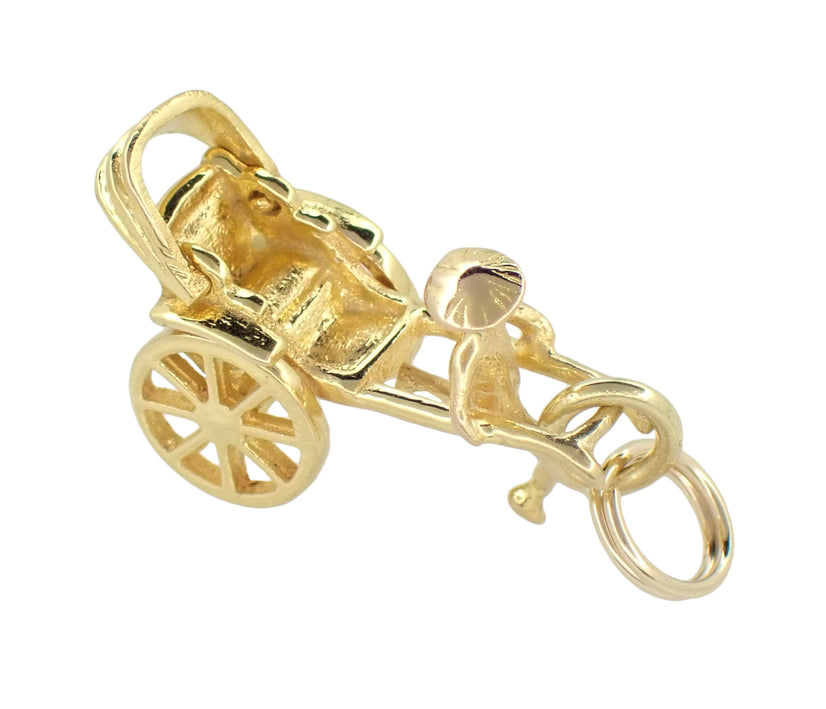 Vintage Rickshaw Charm with Movable Wheels in 14 Karat Yellow Gold