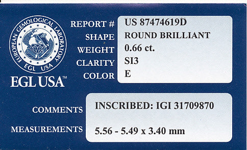 Natural 0.66 Carat Loose E Color SI3 Clarity Round Brilliant Cut Diamond | EGL USA Certified Very Good Symmetry