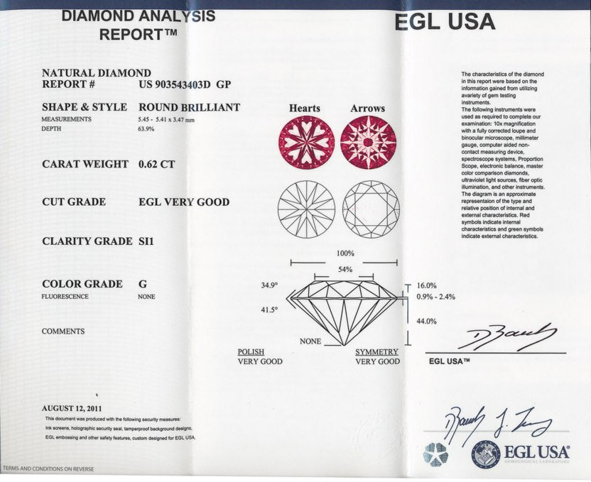 0.62 G Color SI1 Clarity Natural Loose Round Diamond EGL USA Certified | Hearts and Arrows Cut
