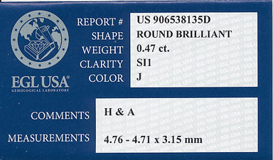 0.53 Carat Round Loose Diamond D Color SI1 Clarity Ideal Cut | EGL Report 5.2mm | Brilliant Hearts and Arrows