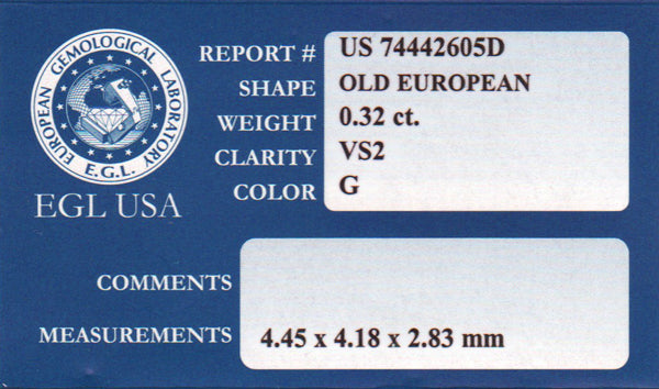 This Old European cut diamond includes a diamond report from the European Gemological Laboratory ( EGL USA ).