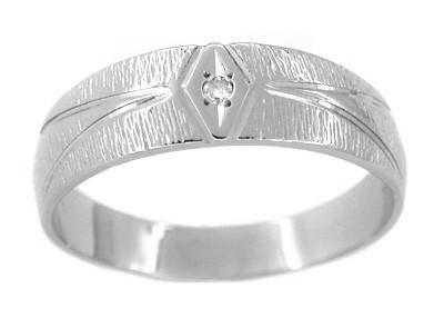 This unique 14K white gold estate mens wedding band from the 1960's is set with a 0.03 carat shimmering round diamond. This wonderful vintage wedding ring for a man features geometric engraving over a gleaming bark finish. Styled in a tapered design, this ring measures 7.0-4.0 millimeters in width. Size 12 1/2 and can be resized.