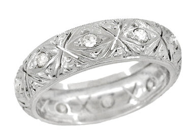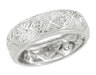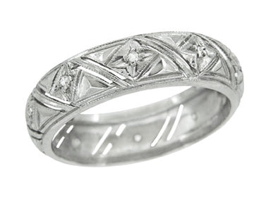 Crafted in the 1920's, Millington is an artisan made wide Art Deco platinum antique wedding ring features a detailed engraved geometric cut out des...