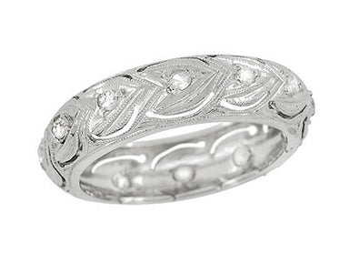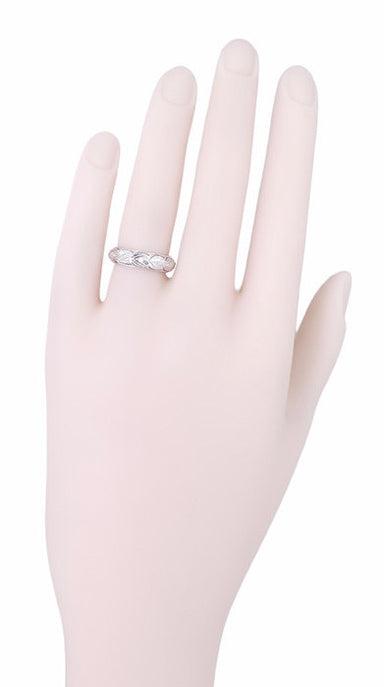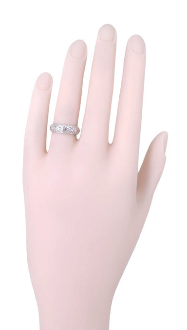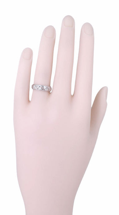 This lovely vintage style carved platinum wedding ring features a simple romantic flowers and leaves engraved pattern around the band and measures ...