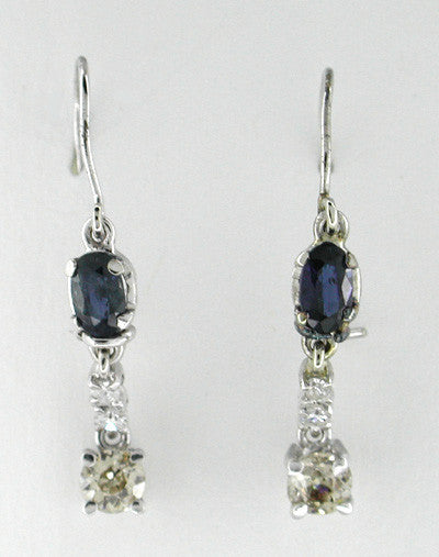 Finely crafted in 14K white gold, these drop estate sapphire earrings, circa 1930's, are drop dead gorgeous, and will catch the light with every movement of your head. Lovely oval blue sapphires ( September birthstone ) and round diamonds flow downward into scintillating old mine cut champagne colored diamonds for a total diamond weight of 0.60 carat for the pair. Hook back kidney ear wires help to secure these wonderful earrings. These vintage blue sapphire earrings are perfect for special occasions and will make you feel special every time you put them on!