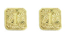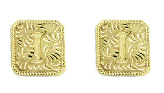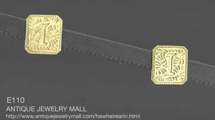 These genuine vintage Hawaiian Heirloom estate earrings are fashioned in 14K yellow gold delicately engraved with the initial letter "I". A lasting reminder of your glorious island vacation, these small gold stud earrings measure approximately 5/16 inch square and feature notched posts for security and comfortable 14K butterfly backs, perfect for anytime wear.