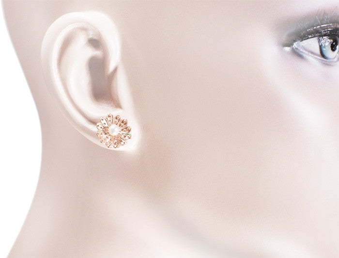 These unique Victorian pearl sunflower earrings in 14K rose ( pink ) gold feature a beautiful 4.5 millimeter genuine cultured pearl at the center of each lovely blossom.