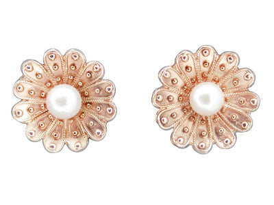 Artisan hand crafted, these delightful rose gold pearl stud earrings measure 1/2 inch in diameter and are meticulously detailed with granulated gold beads of dew lining the petals of the pretty flowers. These elegant classic 1900's vintage Victorian floral design pink gold pearl earrings are sure to become a favorite to wear and enjoy for all seasons!